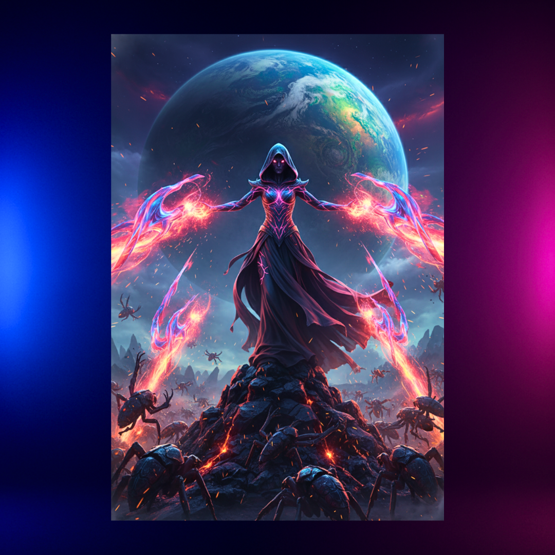 When the Klythar Swarm descended upon the valley, millions of insectoid warriors pouring across the plains, Sarasha did not wait for orders. She sprinted ahead of her squad, Flash Fire blazing outward as a spiraling ribbon of living flame. Just before reaching the front line, she looked back—one fierce, unwavering glance—and her friends followed. In that moment, they did not see a mage. They saw a beacon. A promise. A woman and a weapon fused by destiny, charging into the darkness to carve a path for those behind her.