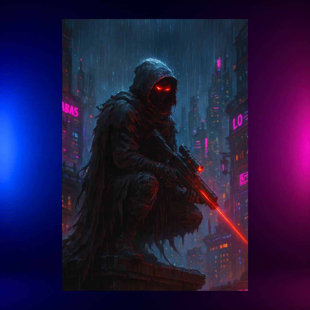 They call him Kill-Shot — a shadow that hunts in the neon rain. Once a soldier, now a ghost, he roams the high spires of Nova-9 with nothing but his plasma rifle and a debt written in blood. The red glow beneath his hood is the last thing his marks ever see — the reflection of justice in a world that forgot what mercy means. He doesn’t miss. He doesn’t speak. He just locks on, exhales, and fires.