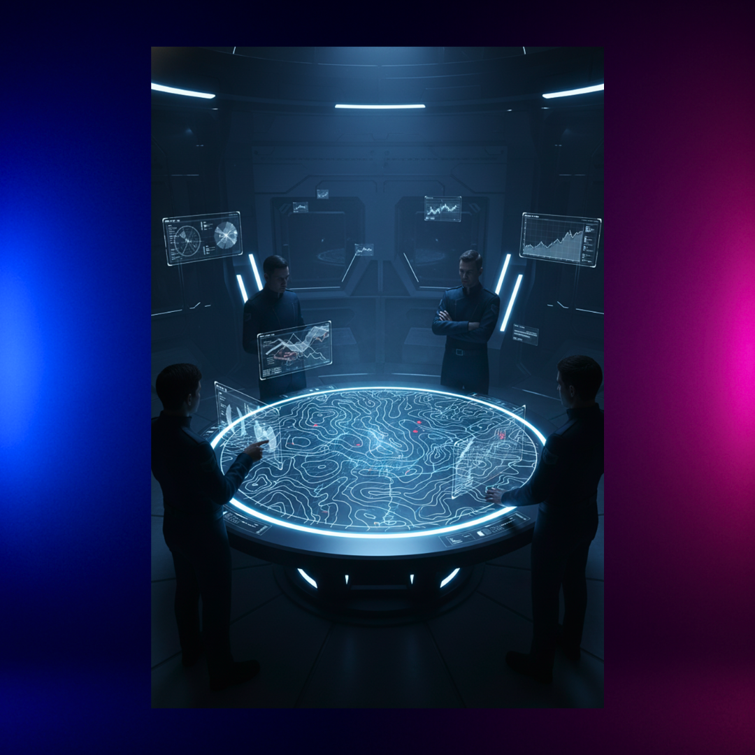 Contours shift, threats pulse red, and a digital fireteam of three advances toward a lone waypoint. Four strategists study the hologram in cold silence, each calculating the next move.