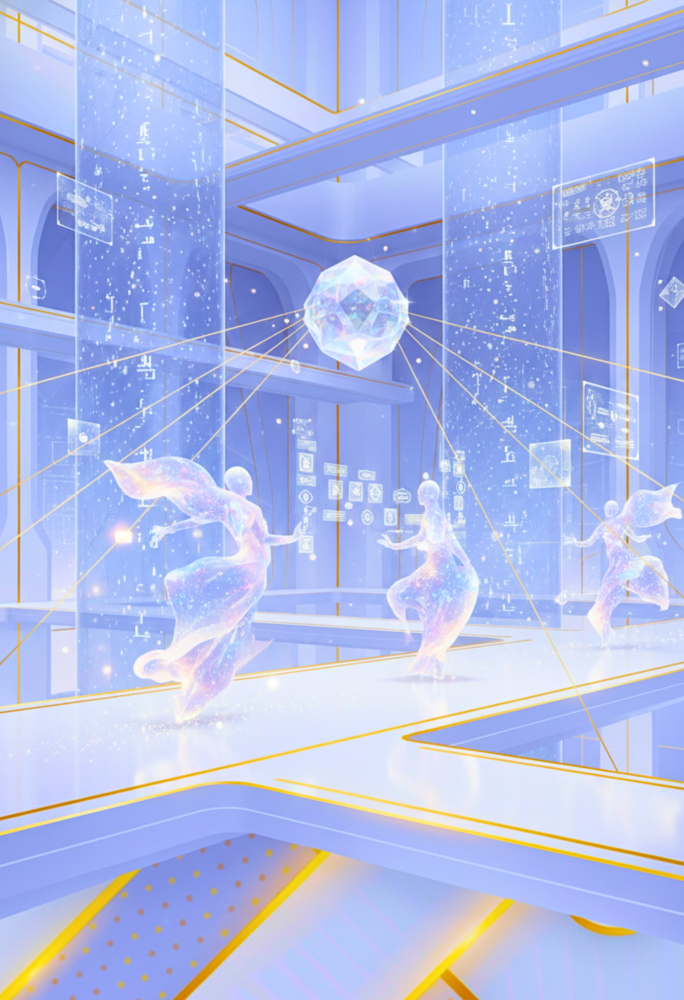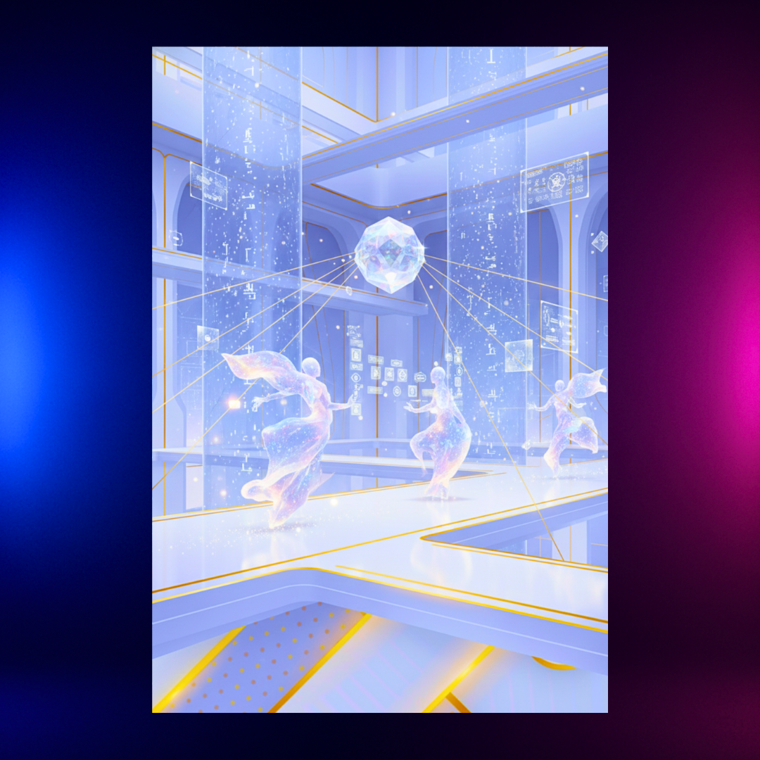 What remains of them now are luminous forms of thought and energy, drifting freely through their sky-spanning sanctums — structures of soft light and gold framework, like the image you provided. Every surface in their world hums with quiet intent, storing the entire history of their people, every discovery, every memory. They live not in cities, but in networks of pure information woven into physical space, where learning is sustenance and wisdom is purpose.